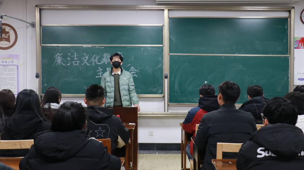 会上,袁铭泽从学廉、思廉、崇廉、守廉四个方面进行讲述,深入剖析了廉洁文化内涵、实践途径和意义,并结合现实生活案例,向同学们强调了廉洁教育的重要性,指出广大青年应心怀清廉之心,以廉心守初心,做无愧于青春、无愧于时代、无愧于党和人民的“青”廉人。