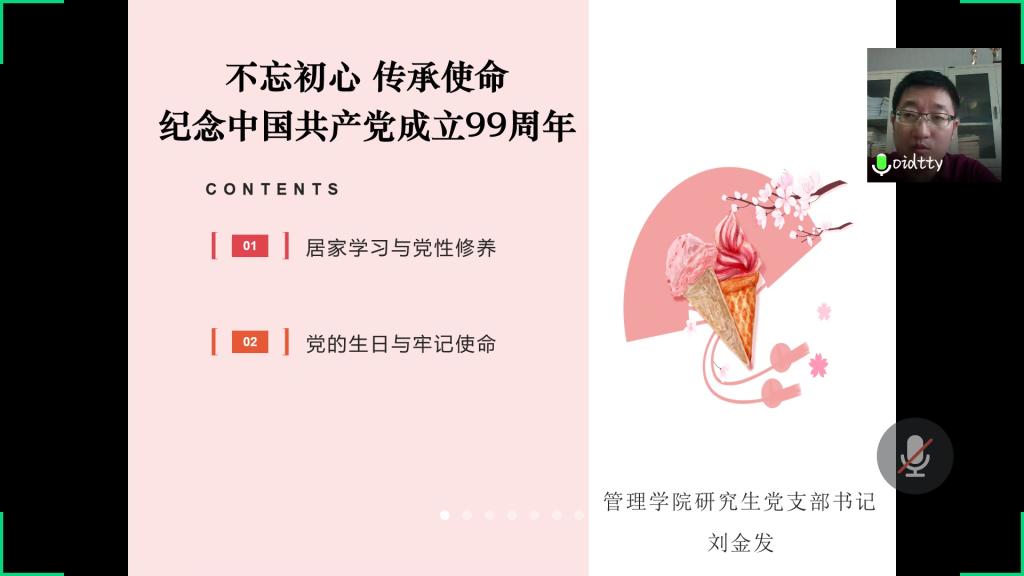 2020年6月23日17时,海角社区 研究生党支部在线上开展"支部书记讲党课"活动。本次党课主题为“不忘初心,传承使命——庆祝中国共产党成立99周年”。海角社区 研究生党支部书记刘金发同志担任主讲人。