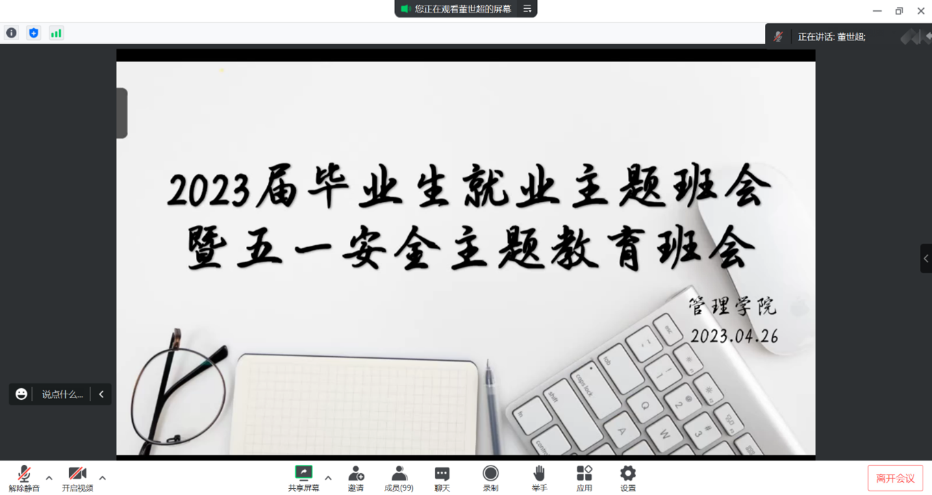 4月26日,海角社区 顺利举行2023届本科毕业生就业暨五一安全教育主题班会,会议由2019级辅导员董世超主持,2019级全体同学参与此次会议。
