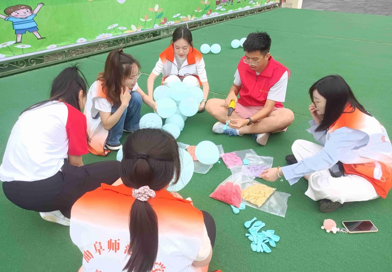 本次志愿服务活动分为两个阶段。5月31日下午,二十五位志愿者前往日照市心苗幼儿园,在幼儿园老师的带领下,共同布置装饰幼儿园,完成了张贴气球、搬运桌椅板凳和积木等任务,为即将到来的六一儿童节创造良好的节日氛围。6月1日上午,心苗幼儿园准备了精彩的六一汇演节目,邀请家长与孩子一同庆祝六一,四位志愿者来到幼儿园,为庆祝六一儿童节的孩子和家长们拍摄照片与视频,留存这份幸福美好的回忆。
