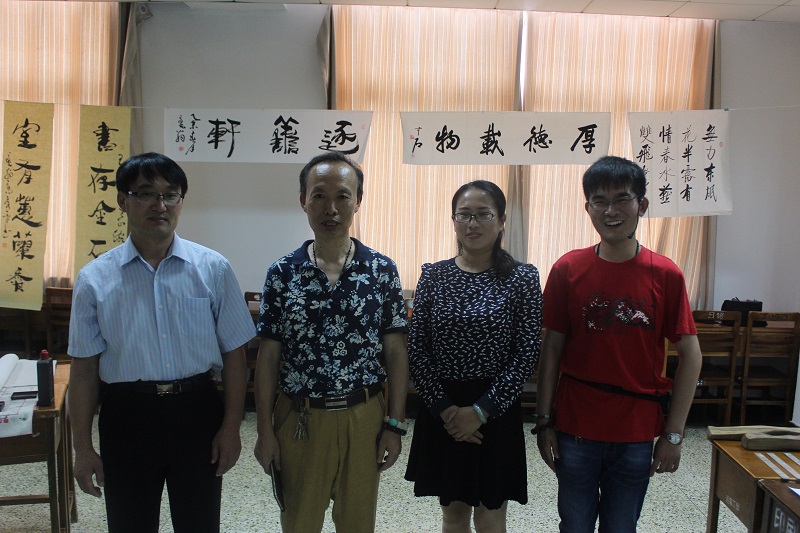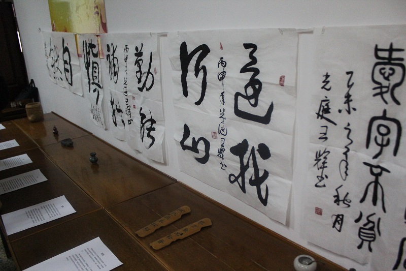 9:30,展览会准时开始。主持人首先向大家介绍了此次展览会展品的收藏者——王辉。王辉是海角社区 2012级优秀毕业生,在大学四年的时间里担任2012级工商管理班班长,曾任海角社区 13届学生会副主席。王辉学习成绩优异,多次在院校级比赛中获得奖励,收集文房墨宝作为他的一项兴趣爱好一直坚持到现在。此次展览中,一部分书画展品来自王辉亲笔创作,一部分是他的启蒙老师高秀平的得意之作,同时也不乏知名书法家的临摹作品。王辉带领大家一起观赏展出的书画作品,并向大家作详细的介绍。摆满展台的古代书房必备的物件让大家应接不暇,前来参观的同学们认真倾听,赞叹之声充斥着会场。展览会最后,高秀平老师现场提笔挥毫为大家题字,展览会在大家热烈的掌声中结束。