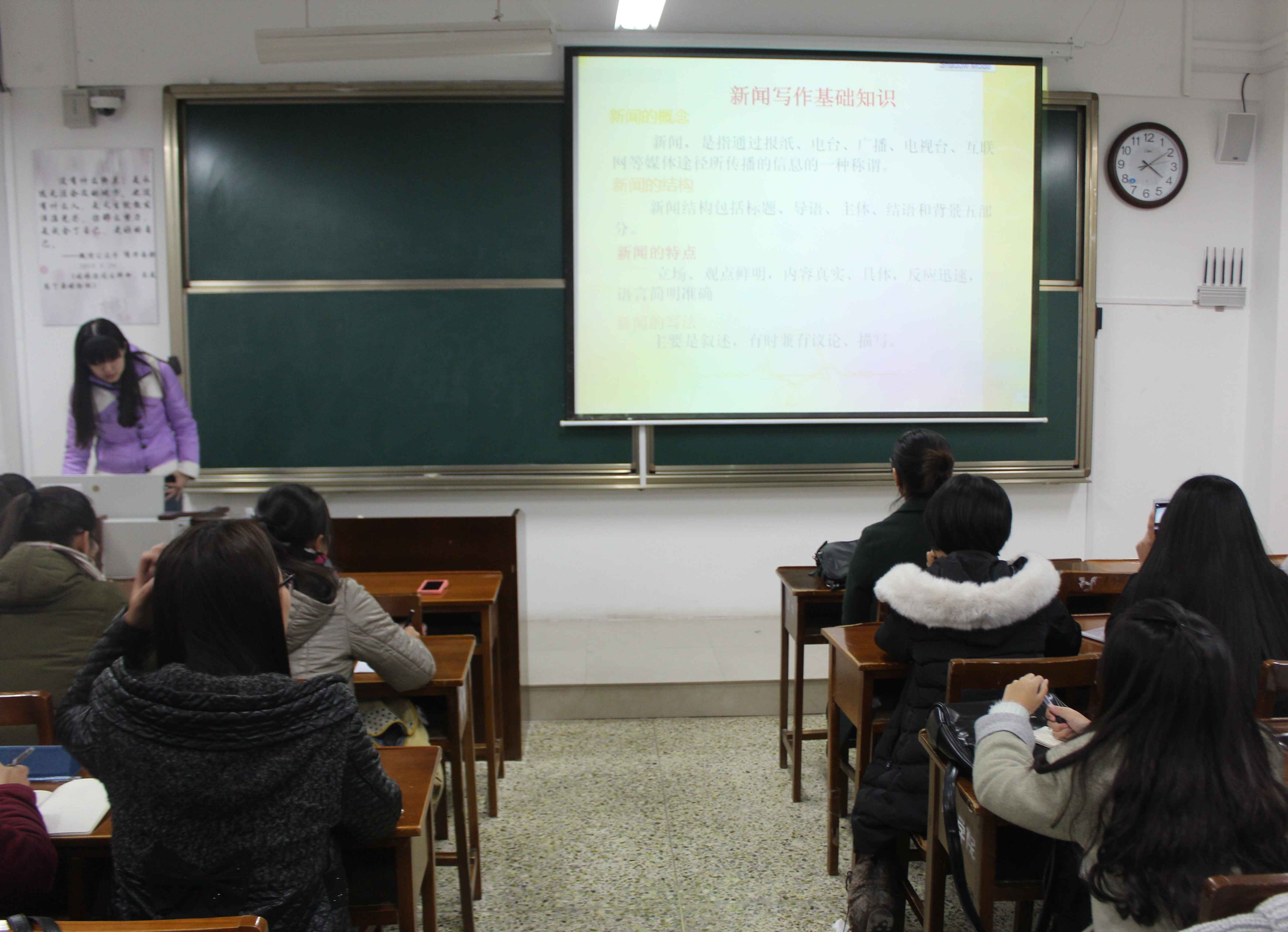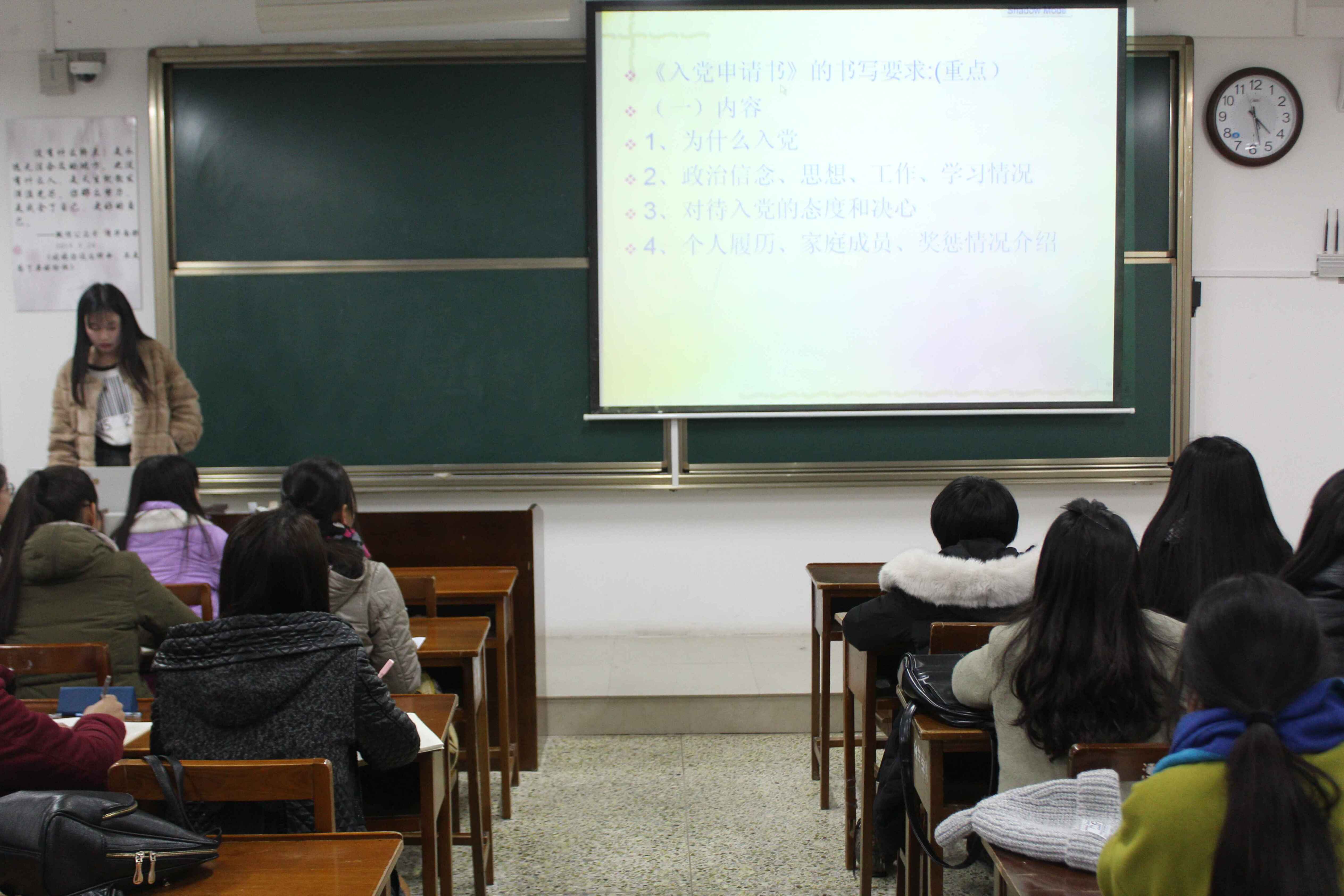 此次培训由团总支宣传部进行新闻写作培训,团总支组织部进行入党申请书写作培训。首先,团总支宣传部副部长吕文蓉用ppt向各班学生干部讲解了海角社区新闻 的一般写法。她强调了新闻写作的格式,并对新闻的字体、字号、行间距等书面格式做了严格的要求。她以一篇规范的新闻为例,向大家具体讲解了新闻的开头以及正文内容的丰富度和准确性,并强调结尾要突出活动意义。随后,吕文蓉向学生干部介绍了单反相机的使用方法以及如何进行活动的拍照。最后,团总支副书记姜春婷也细心讲解了入党申请书具体的格式,并从题目、开头称谓以及书面格式等方面严格要求了入党申请书的具体格式。她认真强调了入党的条件和具体步骤,并鼓励同学们认真学习。同学们仔细听讲,做好笔记。