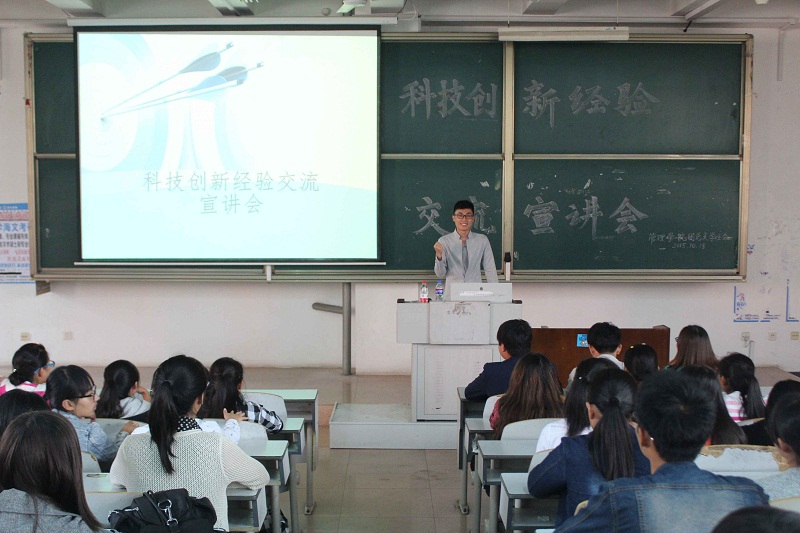 活动伊始,学院学生会科技创新部部长隽云泽通过介绍卡通人物和现代发达的科技将同学们带进了科技创新知识的海洋。他以“挑战杯”科技创新比赛和“创青春”创业大赛为例向大家讲述了科技创新比赛的流程,详细介绍了比赛的具体时间以及比赛应注意的问题,同时提出,团队合作是完成比赛的重要保证。紧接着,获得2014年“挑战杯”省级二等奖的经济学院同学王德军结合自己获奖经验,从选课题、院队员和指导老师以及资料查阅三个方面向大家讲解了如何做好一项比赛。随后,周婷以自己的数学建模的论文为例,讲解了如何写好论文,并鼓励大家积极参加各类科技比赛。最后,袁晟睿讲述了自己参加比赛的经历,并对此次宣讲会做了深刻的总结。同学们认真听讲,全心投入。
