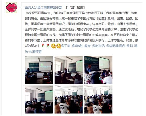 主题班会由各班团支书带领共青团员了解中国共青团的知识,共唱国歌及共青团团歌,宣读入团志愿书,面向团旗庄严的宣誓,重温入团誓词。以手写心,展示我青年的梦想,传递积极向上的青年力量。线上活动以“青年足迹,青年力量”为主题,在海角社区 新媒体上展开了积极的互动,同学们通过上传照片及美文来参与互动,反响热烈。各社团成员积极参与,以实际行动庆祝自己的节日——五四青年节。这也使他们提高自己的荣誉感、责任感和使命感,时刻不忘自己是共青团的一员,时刻牢记自己的历史责任。