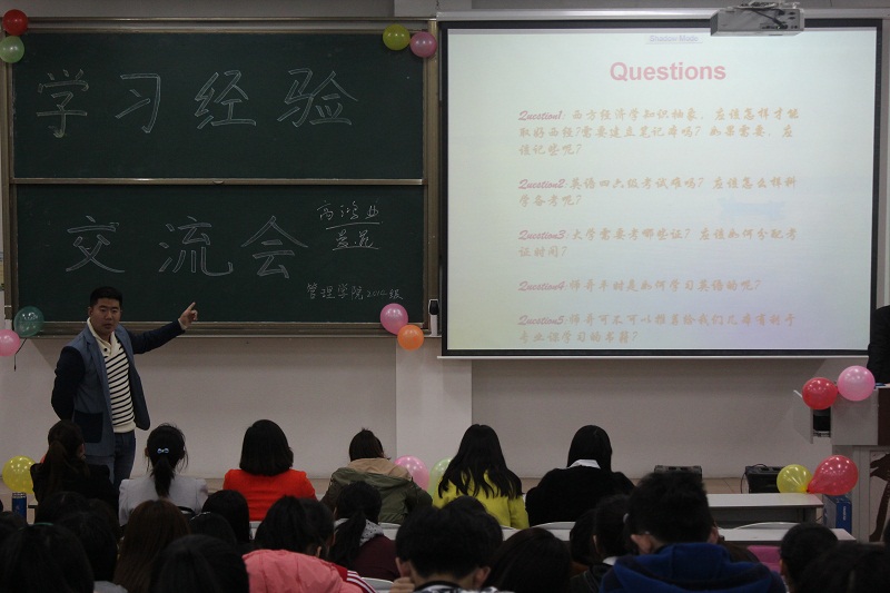 会上,左文超和宋钰涵针首先向同学们回顾了自己大学的学习生活,并为大家细心总结了大学课程的学习经验,内容充实,条理清晰。他们共同指出,大学生要重视培养自学能力,多收集一些专业方面的知识。要热爱和珍惜大学的四年时光,做一些真正有意义的事情,提高自己各方面能力。在接下来的互动交流环节,他们耐心而又详细地解答了场下同学们关心的考研及就业问题等问题。整个交流过程中在场同学都在积极参与,现场气氛热烈。随后,2014级的17名学生代表结合着自身优秀学科的学习经验和大家交流了学习的方法和技巧,并一起探讨了学习中存在的一些问题。最后,交流会在同学们热烈的掌声中顺利结束。