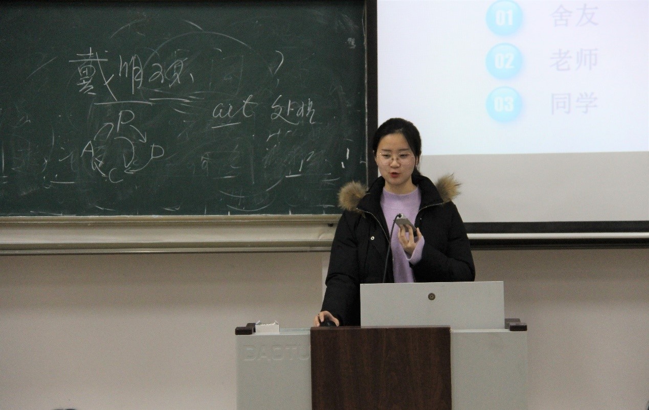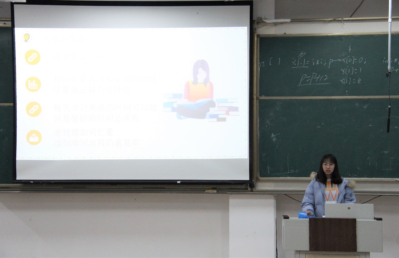 叶楠主要围绕英语学习方法、经验进行讲演。叶楠以丰富生动的语言及组图揭示了当代大学生学英语的现状,并指出“兴趣是最好的老师”以及学习英语的必要性;同时她讲述了与英语相关的竞赛以及自己所获得的奖项,分享了自己学习英语的经验,借以鼓励同学们努力学习英语,积极参加竞赛。随后,张晓晴分享了自己的大学经历,并就同学们所关心的问题“如何度过大学生活”给予了切实的建议,同时,她表示“人的潜能是无限的,希望大家不断进取,不断突破”。