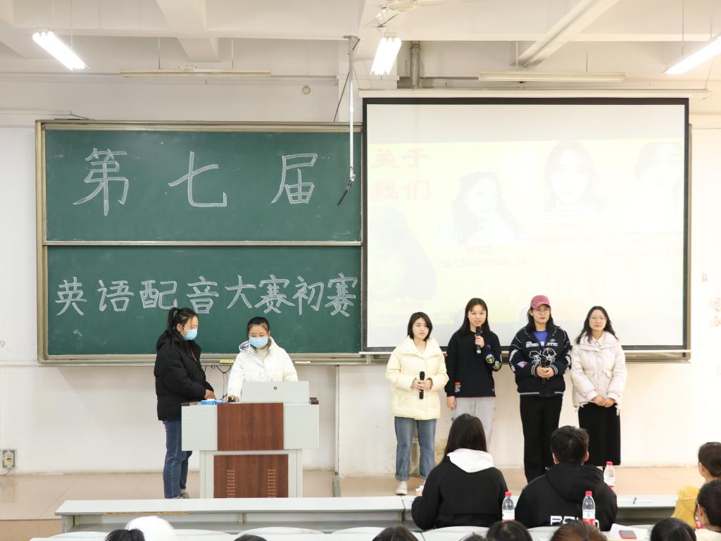 本次比赛分为两个环节。一、团队展示环节:每个参赛小组可自由选择,采用PPT或剪辑视频的形式,展示各自团队的风采。二、英语配音环节:选手们满怀热情,对各自选取的电影片段进行配音,全身心融入电影情景,声音饱含感情,以流畅清晰的英文表达、地道的口语以及生动有趣的表演使现场观众们感受到配音的魅力,带领观众走进电影。不同年级学生在比赛中默契配合,共同上演了一场精彩绝伦的视听盛宴。随后,以四个小组为一轮公布成绩,紧张刺激的比拼暂停一段落,由特邀嘉宾现场演唱一首《岁月神偷》,引起全场感怀。最终,主持人宣布共有“sunshine队”、“Yes more land队”、“wonderful队”等8个队伍晋级决赛,这些队伍将再接再厉、砥砺前行,继续在决赛中大放光彩。