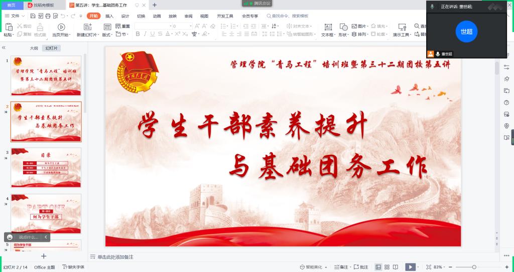 (通讯员:刘元枫)为认真贯彻落实党的二十大精神,进一步提高学生干部的素质,增强基层团学组织的创新能力、实践能力和组织协调能力,12月11日,海角社区 采用线上形式顺利举办“青马工程”培训班暨第三十二期团校第五讲,本次培训的主题是“学生干部素养提升与基础团务工作”,培训会由团委书记董世超主讲,青马工程培训班全体成员参与。