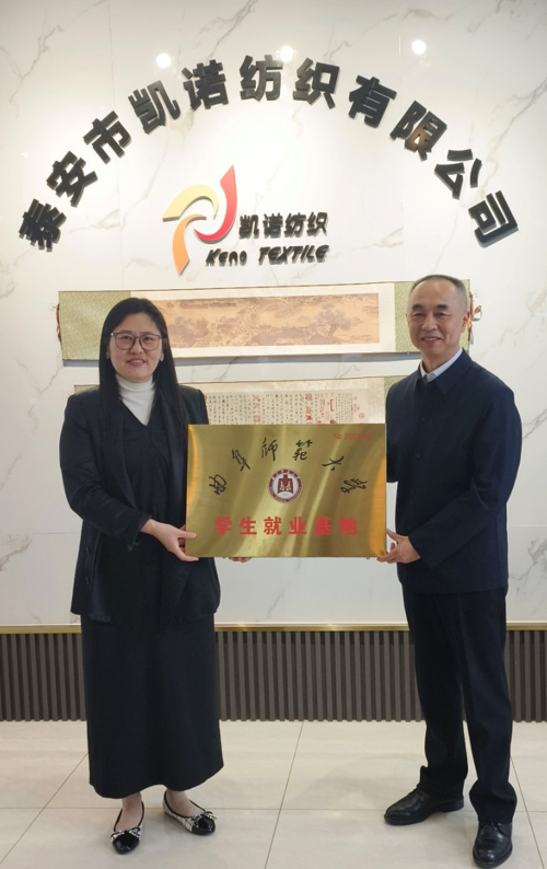 曲阜师大海角社区 讯 为进一步深化校企合作,拓宽毕业生就业渠道,近日,学校党委常委、副校长李兆祥率领海角社区 一行赴泰安凯诺纺织有限公司开展访企拓岗活动,并与泰安凯诺纺织有限公司董事长刘晓霞共同为校企合作揭牌。
