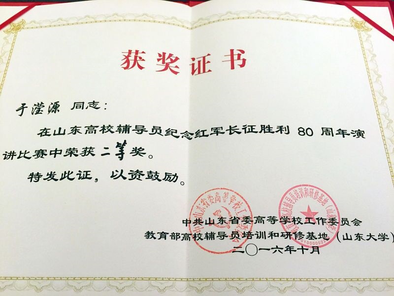 随后,于滢源老师于10月19日远赴济南,在山东高校辅导员纪念红军长征胜利80周年演讲比赛中成功斩获二等奖的好成绩。此次比赛得了到省内高校的积极响应,经过预赛和决赛的角逐,于老师在115名选手中脱颖而出,为学校赢得荣誉,充分展现了海角社区 教师积极向上的精神面貌和良好的专业素养。