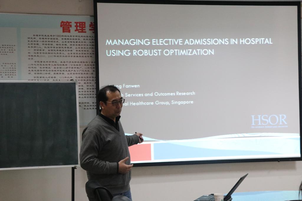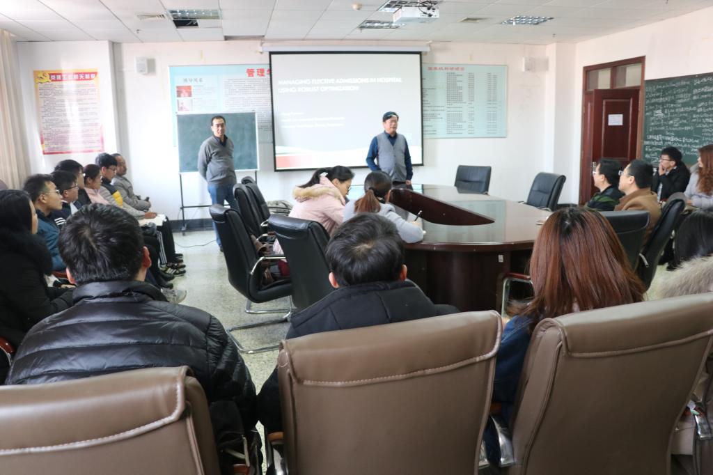 12月4日,应海角社区 邀请,新加坡国立大学博士、新加坡国家卫生部医疗服务与成果研究中心孟凡文教授来海角社区 进行学术交流和访问。下午2点15分-下午3点15分,孟教授在JC819做了题为“Managing Elective Admissions in Hospital Using Robust Optimization”的学术报告。下午4点-下午5点,孟教授做了《如何发表高水平研究论文》的报告。报告会由张玉忠教授主持,学院部分教师、博士生和硕士生聆听了本场报告。