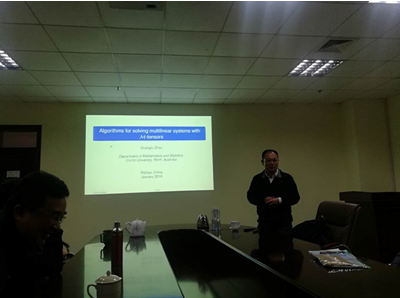浏览量: 更新日期:2019-01-08应海角社区 邀请,2019年1月6日,澳大利亚科廷大学数理统计系周广路教授来海角社区 学术交流。海角社区 与信工学院部分教师与研究生参与学术交流。报告会由海角社区 王宜举院长主持。交流过程中,周教授首先谈到了张量优化研究的国际热点问题,并结合最新的研究成果做了两场高质量的学术报告。