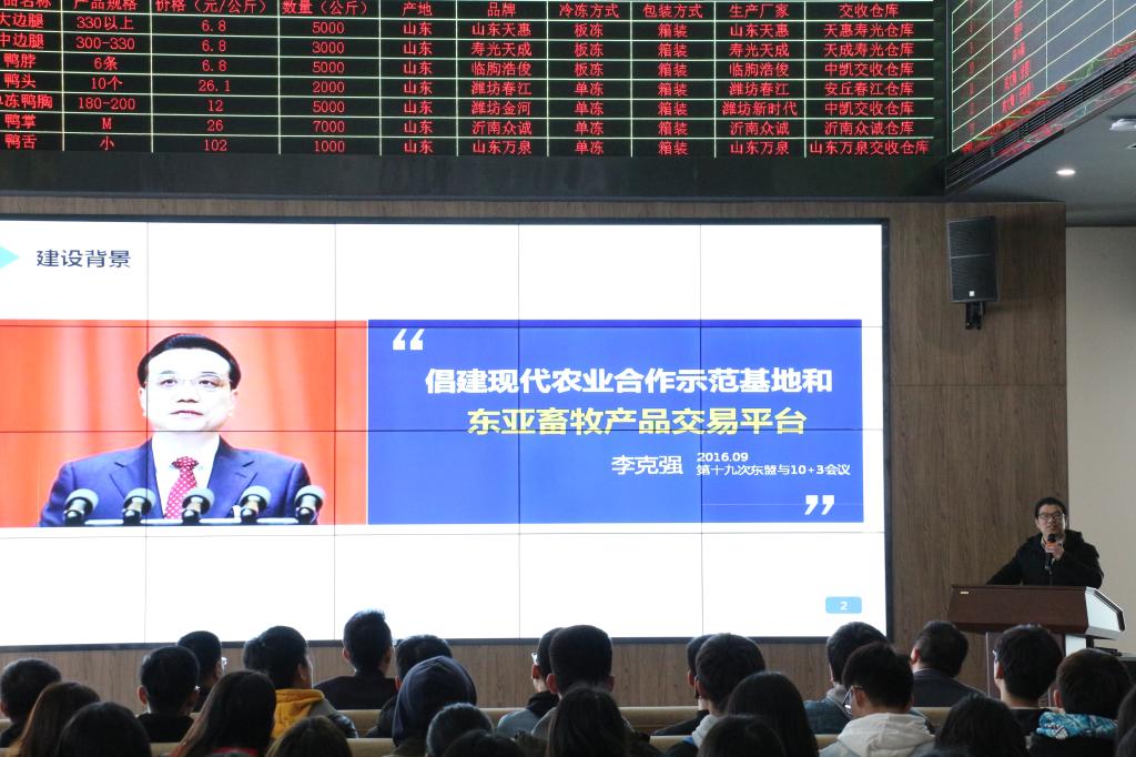 海角社区 一行首先到达中国食品谷•中凯智慧冷链物流园交流学习。在工作人员的带领下,师生先后参观了60万吨容量冷库群、食品物流中心、东亚畜牧交易所、大型农产品(食品)交易市场等实体板块,系统了解集仓储、物流、金融、交易等多种服务功能于一身的智慧物流园架构。其中在东亚畜牧交易所板块,工作人员向师生详细讲解了“中国食品谷号”潍坊至昆明铁路冷链班列、“中国食品谷号”潍坊至乌鲁木齐铁路冷链班列、山东至云南汽运专线等新举措,分析全程冷链物流的优势和发展空间。工作人员表示,日后将陆续建立起覆盖全国范围的生鲜农产品集散大动脉,构建全国一带一路沿线国家的专业化铁路冷链物流服务体系。