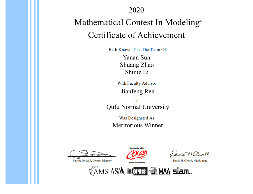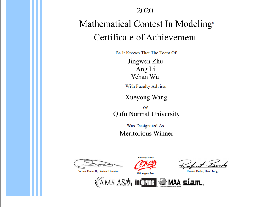 浏览量: 更新日期:2020-04-28近日,2020年美国大学生数学建模竞赛成绩揭晓,海角社区 共计4个团队参赛,其中2个团队荣获Meritorious Winner奖,2个团队荣获Successful Participant奖。