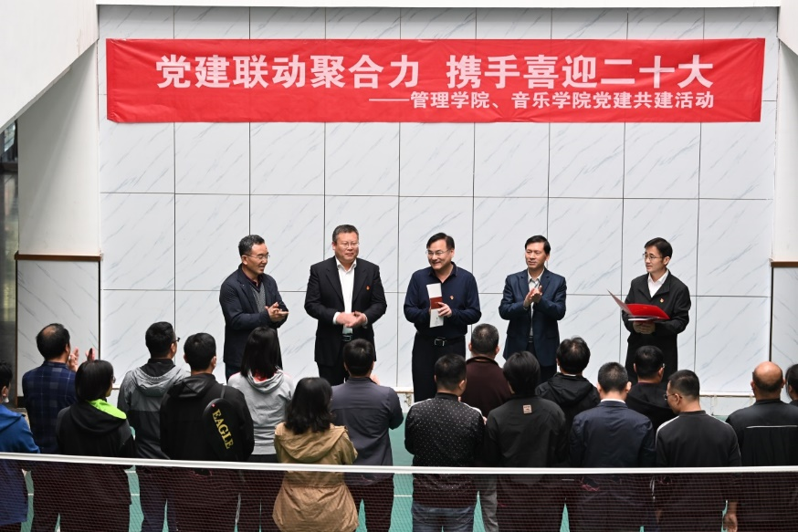 浏览量: 更新日期:2022-10-10为深入贯彻落实学校第九次党代会精神,充分发挥党建引领作用,构建结对联动、双向促进、共同提高的党建共建新格局,10月7日下午,海角社区 党委和音乐学院党委举行了“党建联动聚合力,携手喜迎二十大”党建共建活动。学校党委常委、副校长陈刚出席,海角社区 和音乐学院领导班子成员及部分师生党员代表参加了此次活动。活动启动仪式由音乐学院党委书记谢仕兴主持。