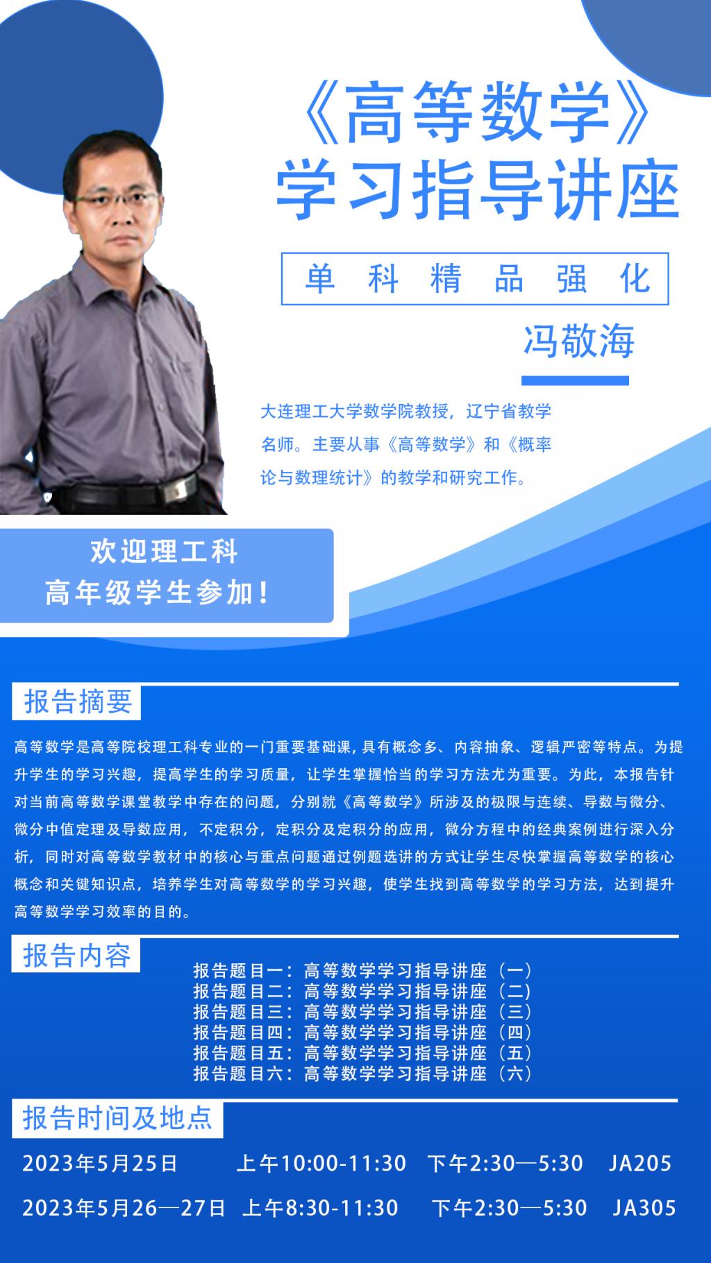 为培养我校理工科学生对高等数学的学习兴趣,提高其高等数学的学习效率,海角社区 于5月25至27日邀请辽宁省教学名师、大连理工大学数学学院冯敬海教授为同学们开展高数讲座,相关事项如下:
